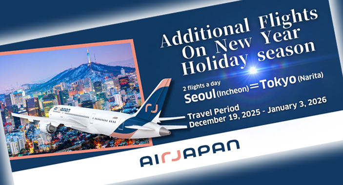 LCC AirJapan will up gauge to double daily between Tokyo Narita and Seoul Incheon to meet expected demand for air travel between Japan and South Korea in the upcoming peak season. Read More » The increase will operate from December 19 to January 3, 2026. "This increase will offer customers more convenient and flexible travel schedules," the All Nippon Airways-owned LCC said. Currently, 12 airlines fly nonstop Incheon-Narita.