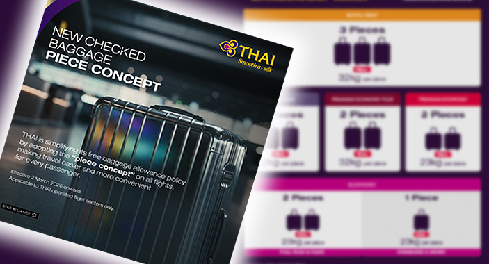Thai Airways International (THAI) has switched its baggage allowance policy from the weight model to the piece model. Read More » The change came into effect late last week for tickets sold for travel from March 2 next year. Under the scheme, domestic travellers within Thailand will be allowed one piece of checkin luggage weighing not more than 32 kilograms for business and 23 kilograms for economy passengers. For international flights, first class passengers will be allowed to check in three bags, those in business and premium economy class two and economy either one or two bags depending on the type of fare. The Star Alliance member said the policy change was to "improve convenience and consistency for international connections and interline travel", provide passengers with clear and transparent baggage entitlements and align its policies with leading global airlines. "Thai Airways remains committed to elevating our service standards to deliver a seamless and memorable travel experience for all passengers," THAI said.