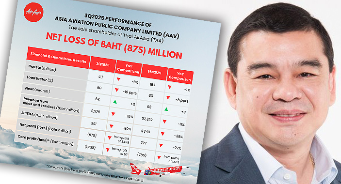 Asia Aviation Public Company (AAV), the parent of Thai AirAsia (TAA) has reported a net loss of 874.7 million baht (US$27 million) for the three months to September 30 2025, compared with a net profit of 3.4 billion baht in the same three months in 2024. Read More »