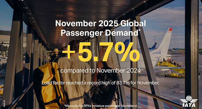 The International Air Transport Association (IATA) reported demand for air travel, measured by revenue passenger kilometres (RPK), rose 5.7% in November last year, compared with the same month in 2024. Read More » Capacity rose 5.4% year-on-year, while passenger load factor increased 0.3 of a percentage point to a record high for the month of November. "November 2025 saw continued strong demand for air travel," IATA director general, Willie Walsh, said. "Load factors reached a new record of 83.7% for the month as airlines continued to satisfy growing passenger demand amid continuing capacity constraints stemming from challenges in the aerospace supply chain. The new year’s resolution for the manufacturing sector must be to increase production to meet the needs of their airline customers." The airline lobby group said the Asia-Pacific region grew RPKs 7.8%, while capacity was 6.8% higher and passenger load factor climbed 0.7 of a percentage point to 85.4%. Despite the strong growth, the IATA report noted "geopolitical tensions" led to traffic between China and Japan slowing to single-digit growth for the first time in 2025.